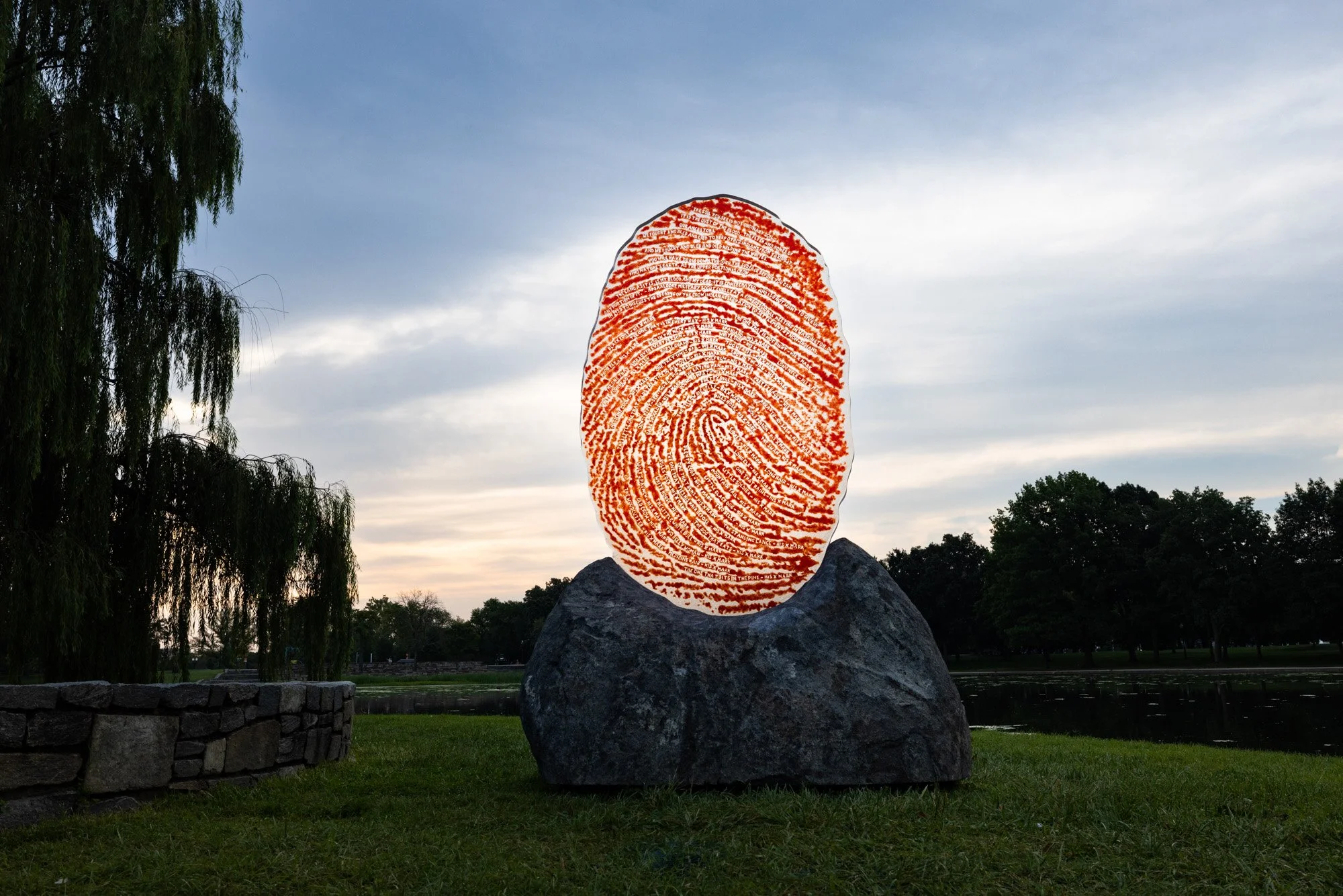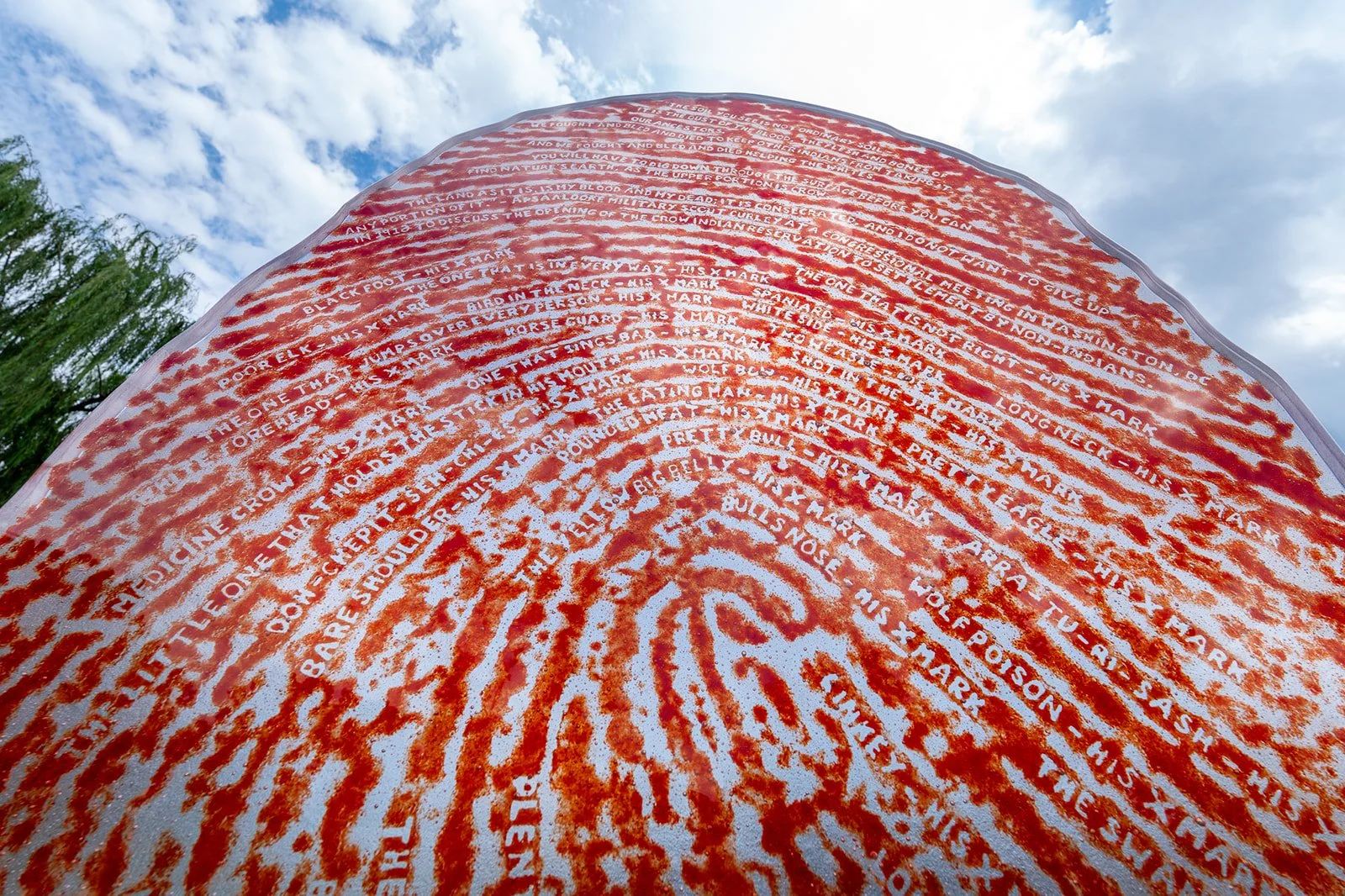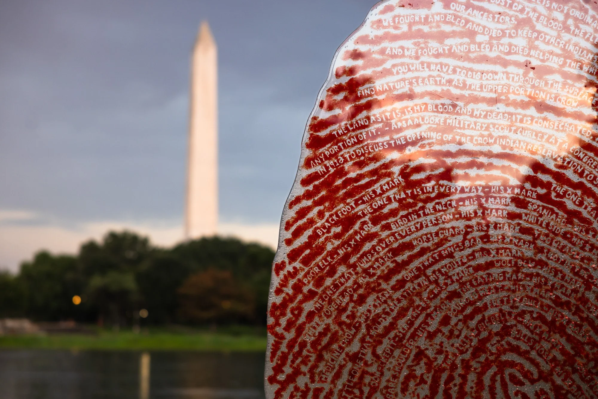 A monumental fingerprint with the names of the Apsáalooke (Crow) Nation chiefs who signed treaties with the US government, in dialogue with the nearby 56 Signers of the Declaration of Independence Memorial