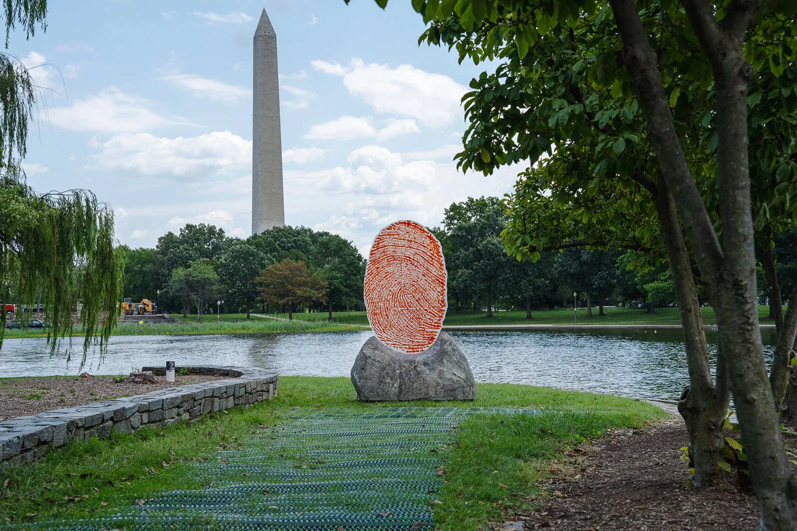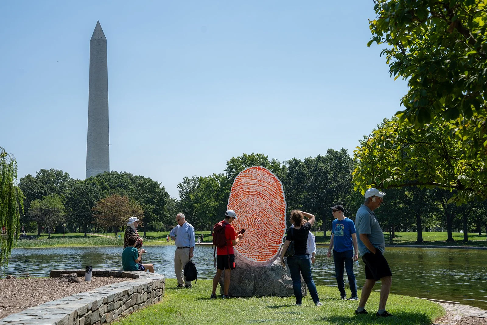Wendy Red Star, who is Apsáalooke (Crow), highlights the legacy of treaties with Indigenous tribes through American history to, as she states, “illuminate the fact that every tribe in America has their own experience with treaties and the complexities of the decisions made by their tribal leaders.” Using her own fingerprint as the model, Red Star created a giant thumbprint on an island in Constitution Gardens, next to the 56 Signers of the Declaration of Independence Memorial. In doing so, she highlights the fact that many treaties with Indigenous leaders regarding the cession of their tribal lands were ratified not with their names but with a thumbprint or an X. Using her own fingerprint as the model, the sculpture ridges include the names of 50 Apsáalooke chiefs and tribal representatives who brokered treaties with the US government between 1825 and 1880. Red Star invites viewers to glimpse this founding story of belonging, land appropriation, and displacement on and through the National Mall.